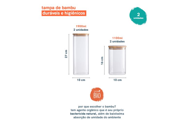 Kit02685 - potes de mantimentos quad 1900/1100ml c/tampa bambu - 4 pçs