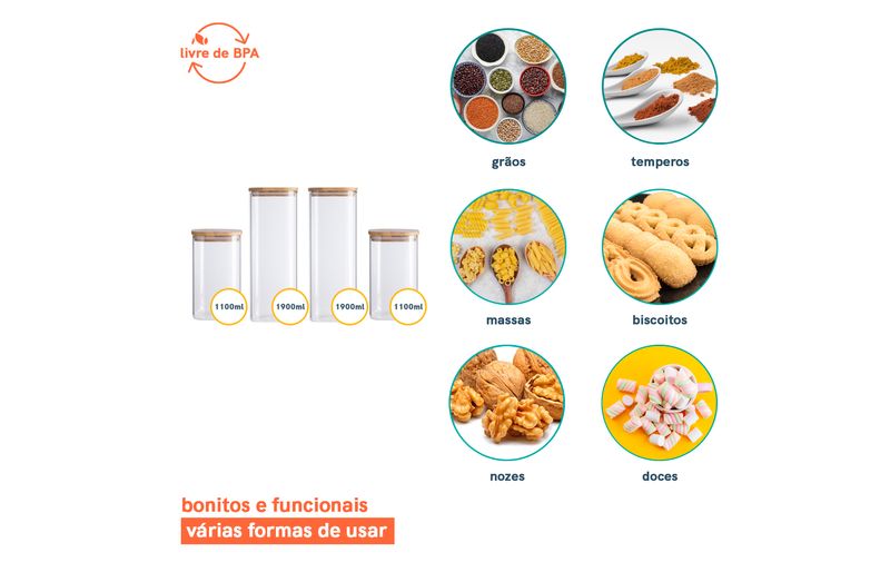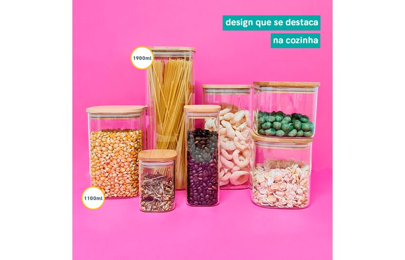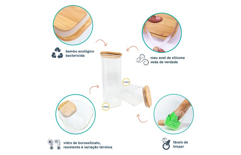 esse é o conjunto de potes de mantimentos quadrado flat com tampa de bambu da oikos. seu formato quadrado ajuda a aproveitar melhor o espaço - ele encaixa direitinho no canto do armário. tampa flat: uma tampa de bambu retinha, fácil de limpar e que fica uma graça na cozinha ;). e não julgue pelas aparências, ele não é só um potinho bonito: com a combinação da vedação de silicone e o bambu antibacteriano, esse pote se torna um verdadeiro mestre na conservação de alimentos! e não é só de comida que vive esse pote: pisca-pisca, pregadores de roupa, decoração de natal, nozes, flores secas, fios, jogos e o que mais você quiser guardar - isso que é versatilidade.