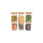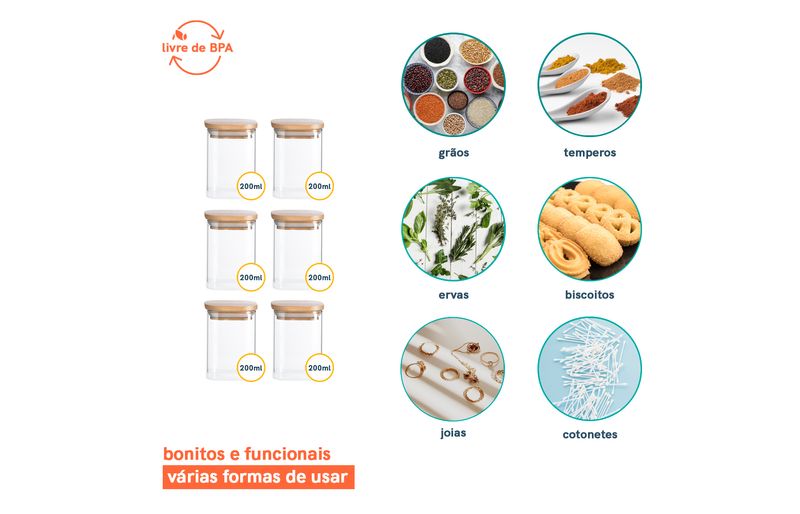 Kit02682 - potes de mantimentos quad 200ml c/tampa bambu - 6 pçs