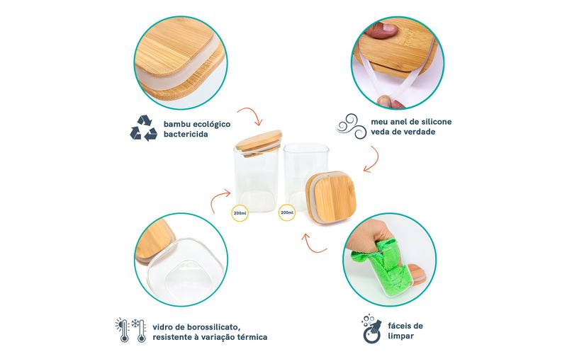 6 unidades - pote de mantimentos quadrado flat 200ml tampa bambu – oikos