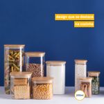 Esse é o kit de potes de mantimentos quadrado flat com tampa de bambu da oikos.