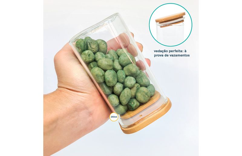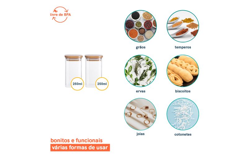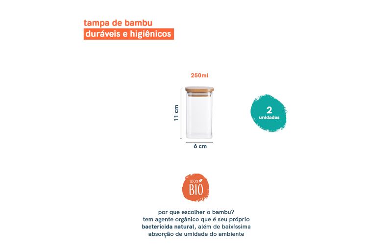 Kit02681 - potes de mantimentos quad 250ml c/tampa bambu - 2 pçs