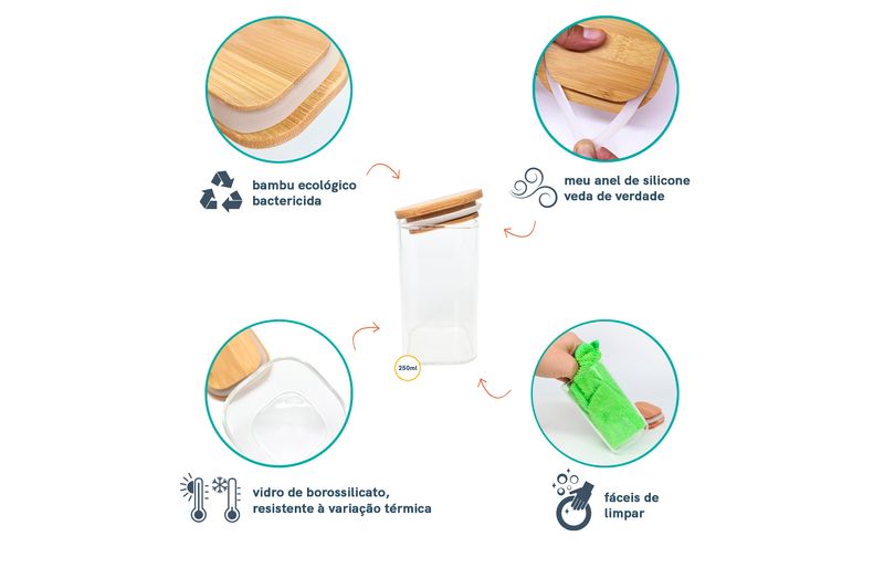 2 unidades - pote de mantimentos quadrado flat 250ml tampa bambu – oikos