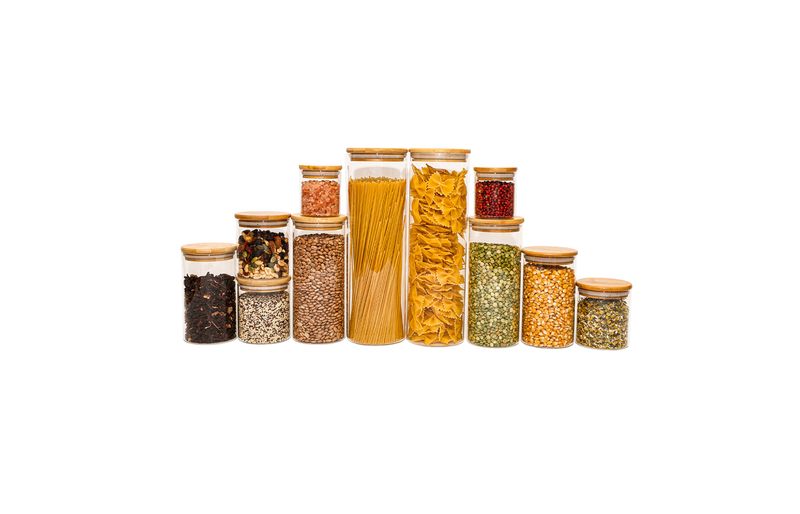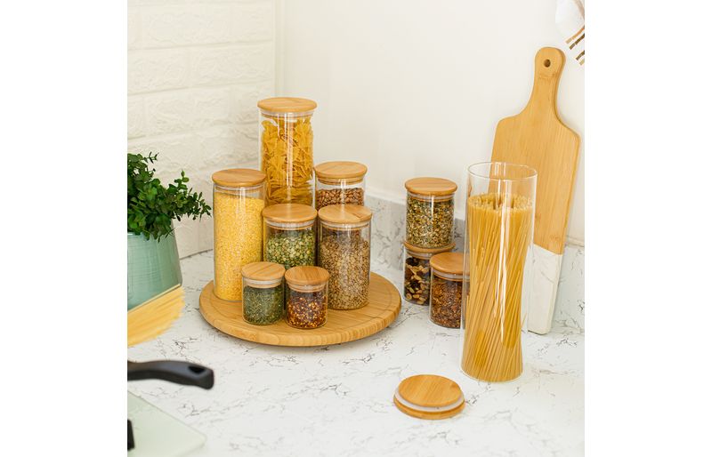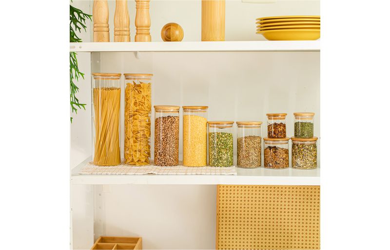 Esse é o kit de potes de vidro hermético para mantimentos com tampa de bambu da oikos.