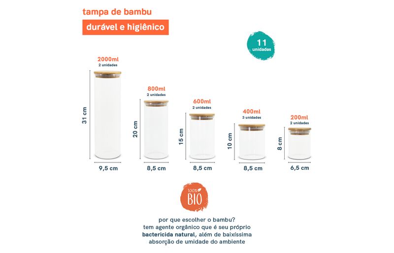 02 potes de vidro hermético para mantimentos de 200ml com tampa de bambu – oikos