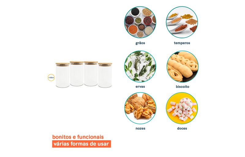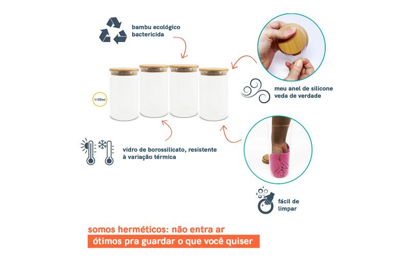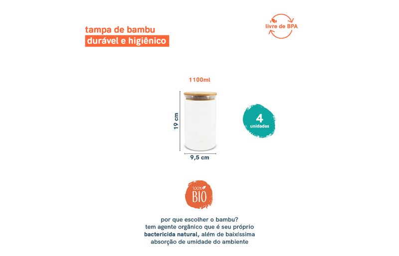 4 unidades do pote de mantimentos de 1100ml com tampa de bambu – oikos