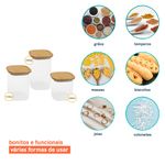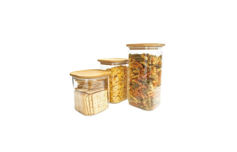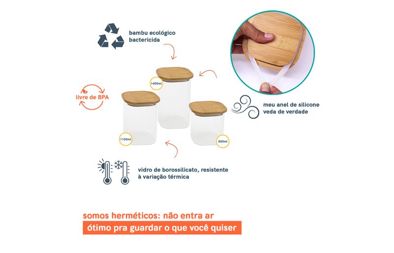 Esse é o kit de potes de vidro hermético para mantimentos quadrado com tampa de bambu da oikos.