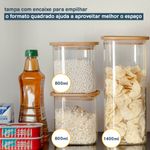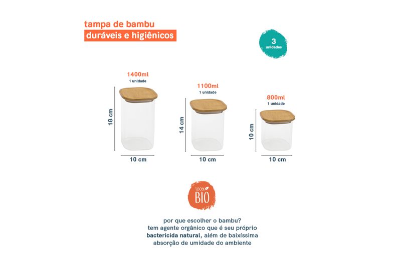 seu formato quadrado ajuda a aproveitar melhor o espaço - ele encaixa direitinho no canto do armário. e não para por aí: sua tampa de bambu é empilhável, o que ajuda mais um pouquinho a aproveitar o espaço disponível em casa. e não julgue pelas aparências, ele não é só um potinho bonito: com a combinação da vedação de silicone e o bambu antibactericida, esse pote se torna um verdadeiro mestre na conservação de alimentos!