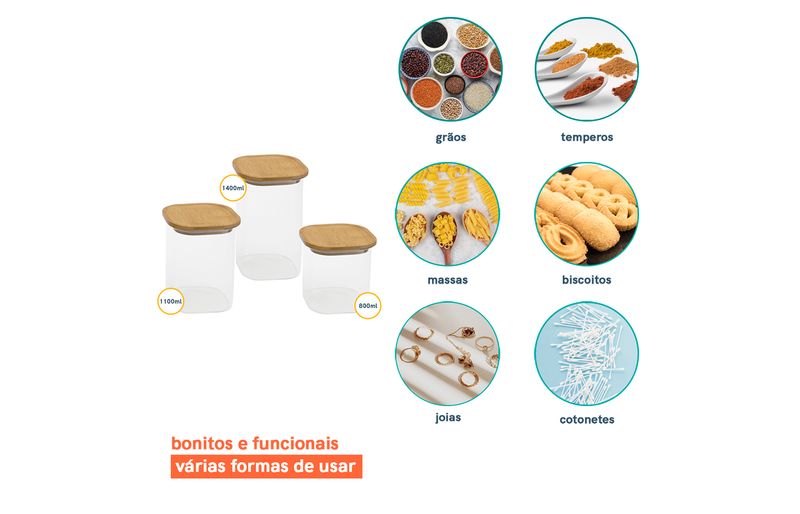 e não é só de comida que vive esse kit: além de temperos, sal e açúcar, neles cabem sementes, joias, curativos, grampos, elásticos, pisca-pisca, pregadores de roupa, decoração de natal, nozes, flores secas, fios, jogos, moedas, balas, botões, chocolates, dados, bola de gude e o que mais você quiser guardar - isso que é versatilidade.