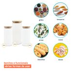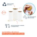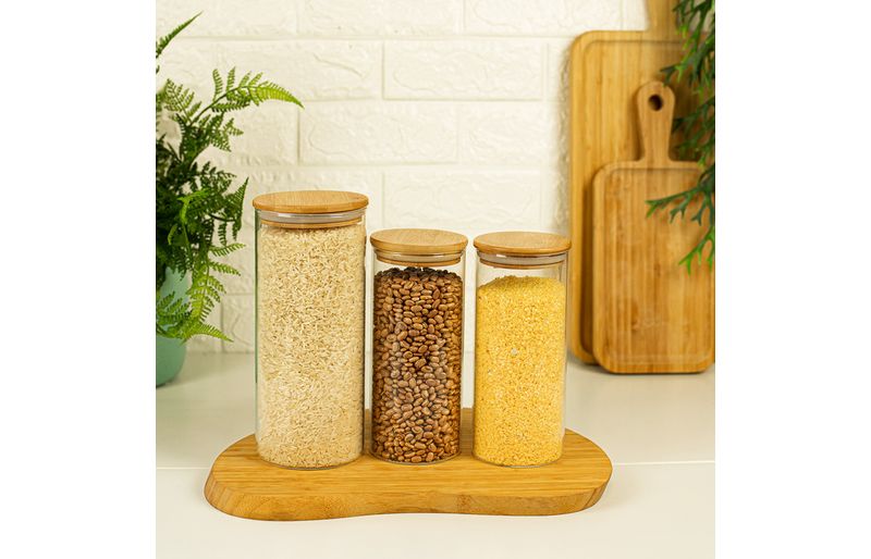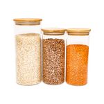 Esse é o kit de potes de vidro hermético para mantimentos com tampa de bambu da oikos.