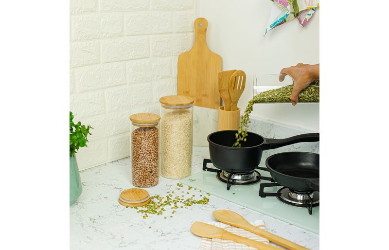 02 potes de vidro hermético para mantimentos de 800ml com tampa de bambu - oikos