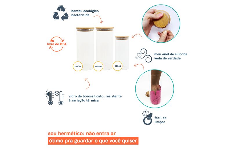 não julgue pelas aparências, ele não é só um potinho bonito: com a combinação da vedação de silicone e o bambu antibactericida, esse pote se torna um verdadeiro mestre na conservação de alimentos!