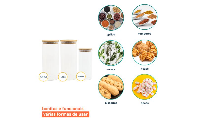 e não é só de comida que vive esse pote, nele também cabe: pisca-pisca, pregadores de roupa, decoração de natal, nozes, flores secas, fios, jogos, moedas, chaves, chocolates, peças de quebra-cabeça, bola de gude, marshmellows, cápsulas de café , itens de costura e o que mais você quiser guardar - isso que é versatilidade.