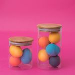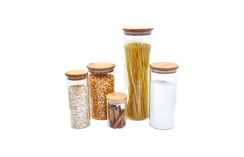 Esse é o kit de potes de vidro hermético redondo para mantimentos com tampa de bambu da oikos.