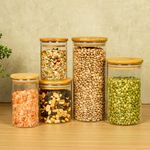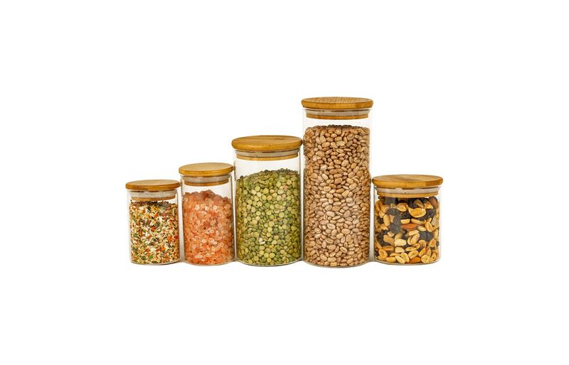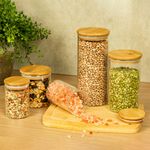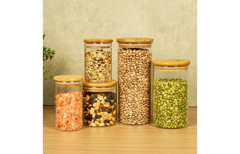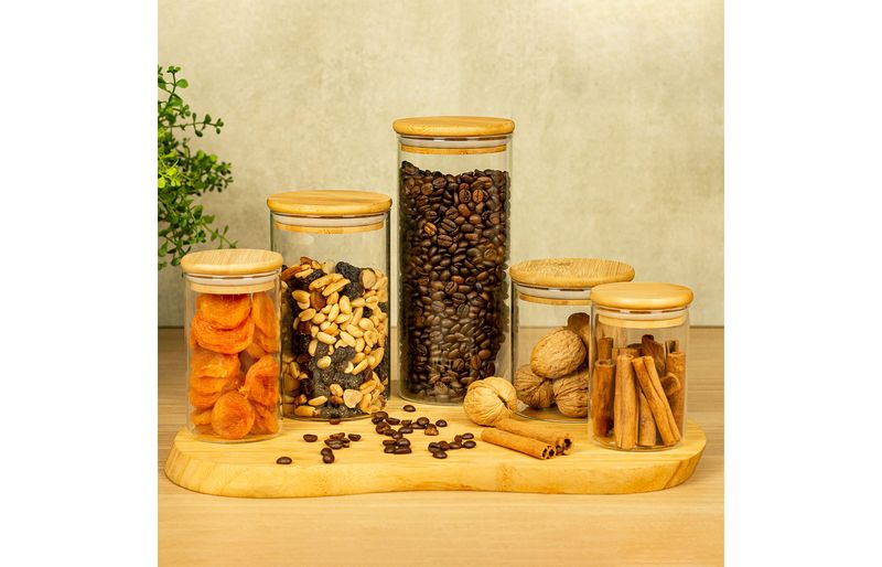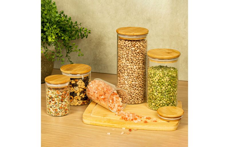 Esse é o conjunto de potes de vidro hermético para mantimentos com tampa de bambu da oikos.