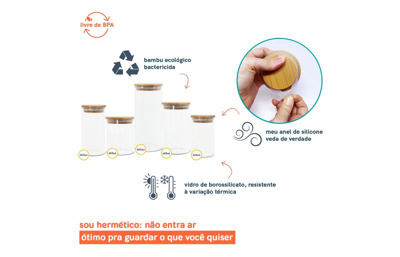 não julgue pelas aparências, eles não são só bonitos: com a combinação da vedação de silicone e o bambu antibactericida, esses potes se tornam verdadeiros mestre na conservação de alimentos!