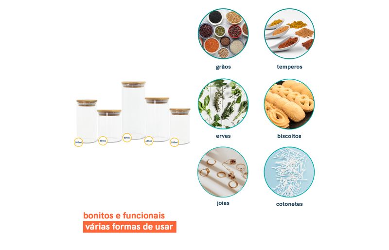 e não é só de comida que vivem esses potes: além de tempero, açúcar e sal, nele cabe purpurina, algodão, moedas, grãos, clipes, grampos, elásticos e outras pequenices que você quiser guardar - isso que é versatilidade.