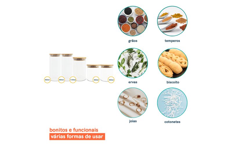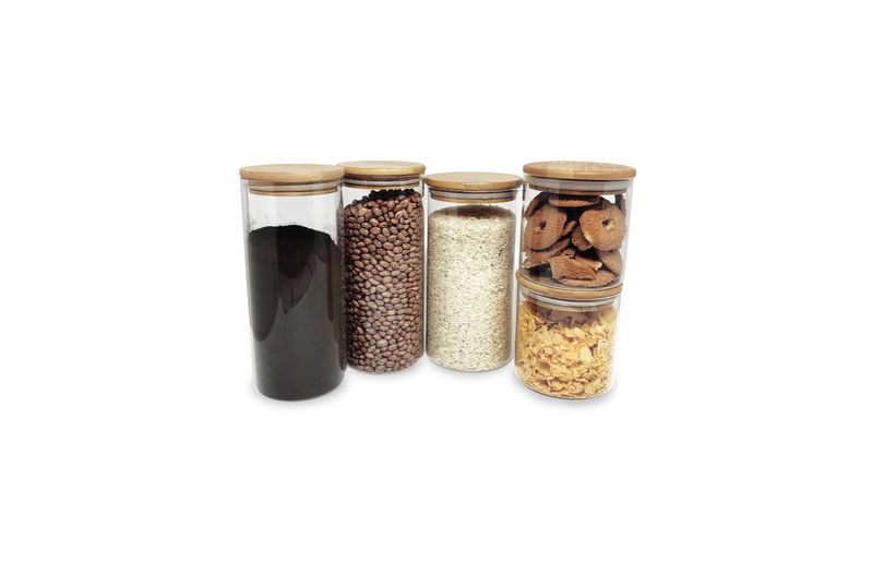 Esse é o conjunto de potes de vidro hermético para mantimentos com tampa de bambu da oikos.