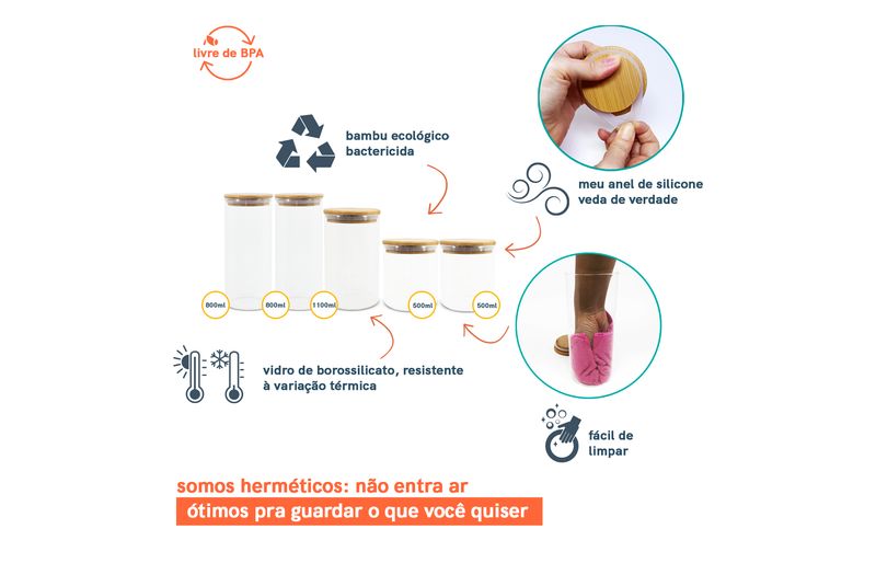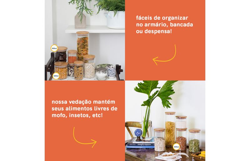 não julgue pelas aparências, eles não são só bonitos: com a combinação da vedação de silicone e o bambu antibactericida, esses potes se tornam verdadeiros mestre na conservação de alimentos!