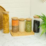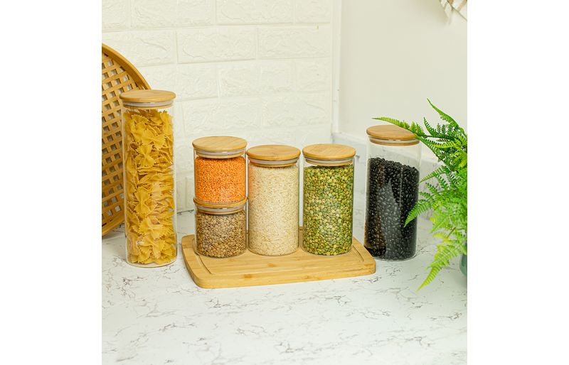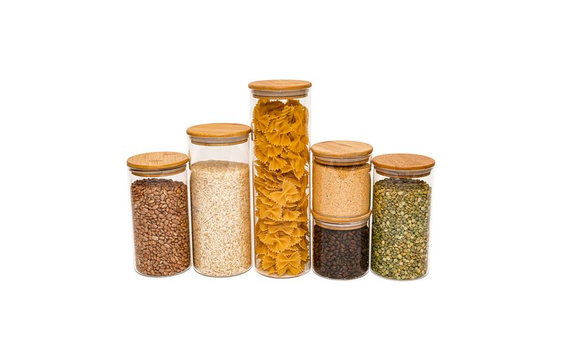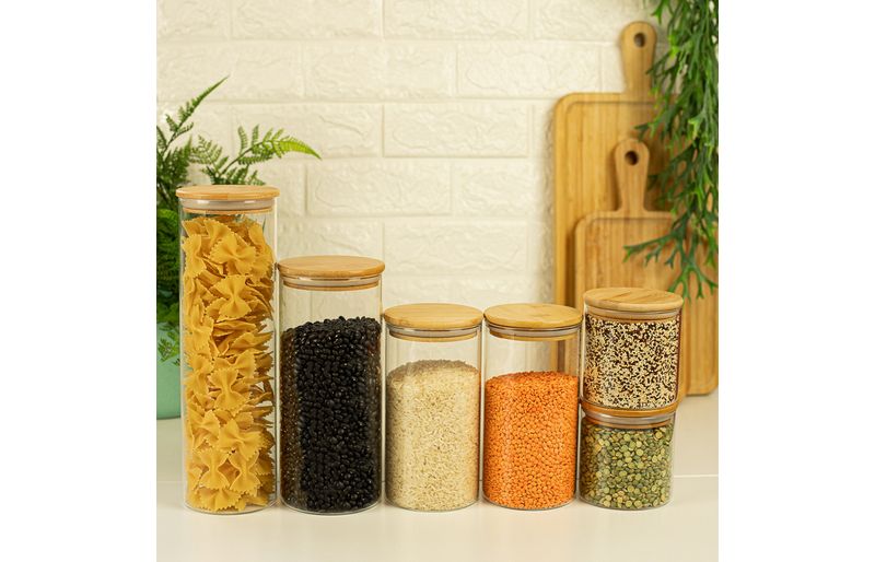 Esse é o conjunto de potes de vidro hermético para mantimentos com tampa de bambu da oikos.