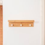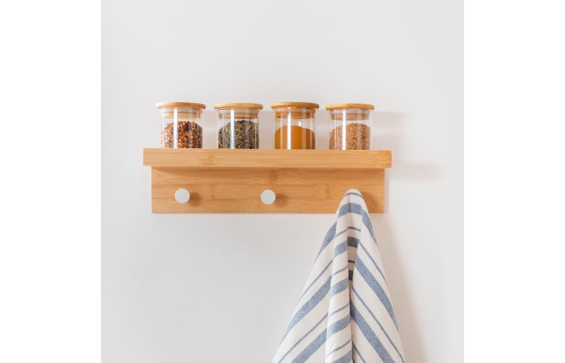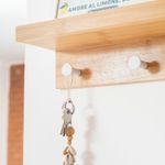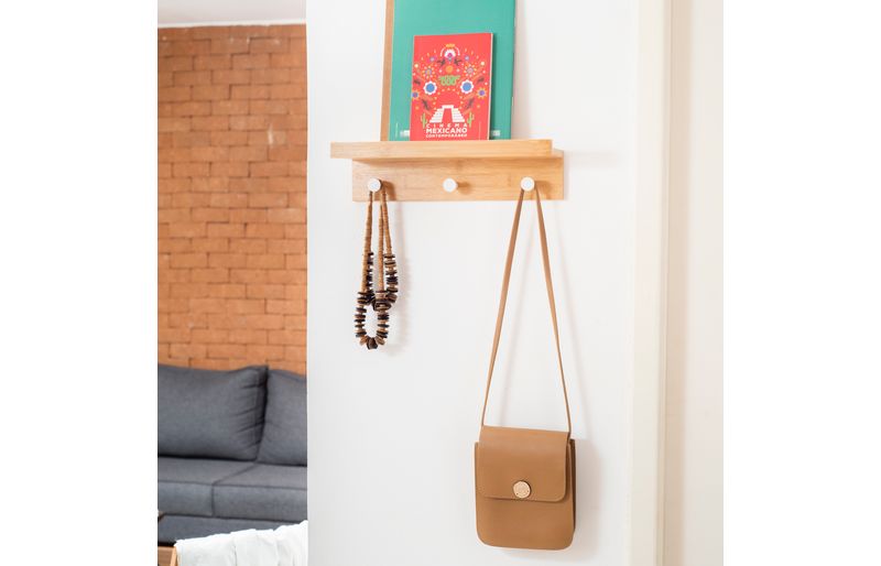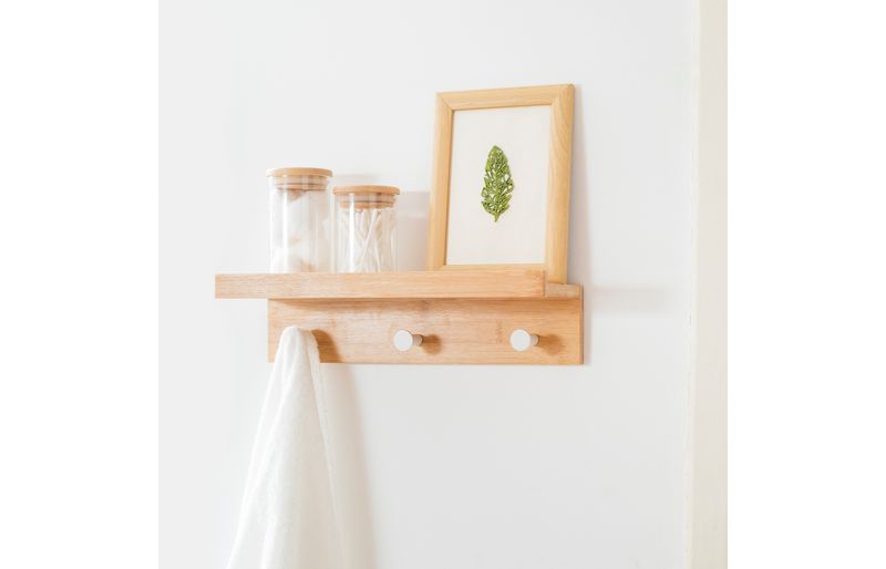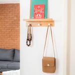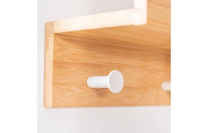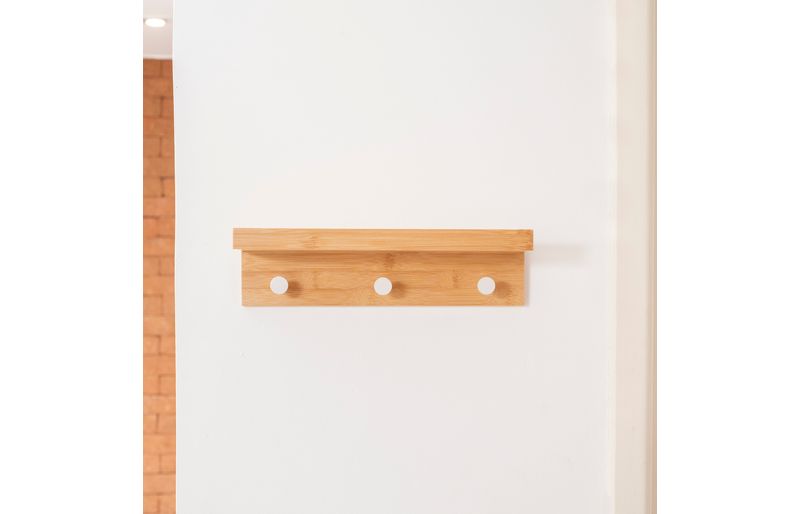 ":: essa é a prateleira de bambu com 3 ganchos de metal da oikos.