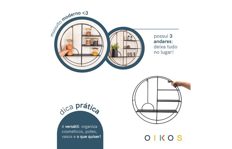 "conheça a prateleira nicho de metal redondo 3 andares da oikos!