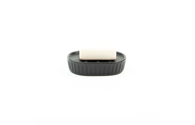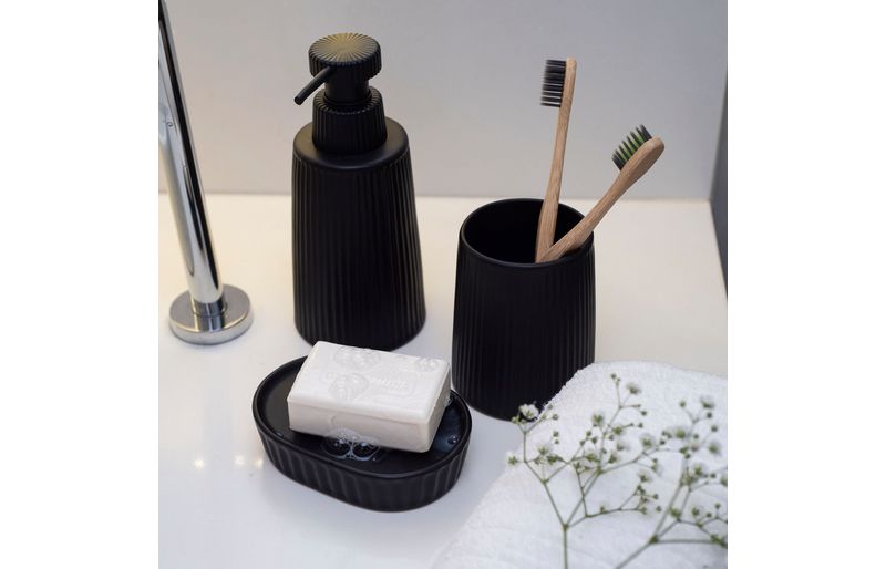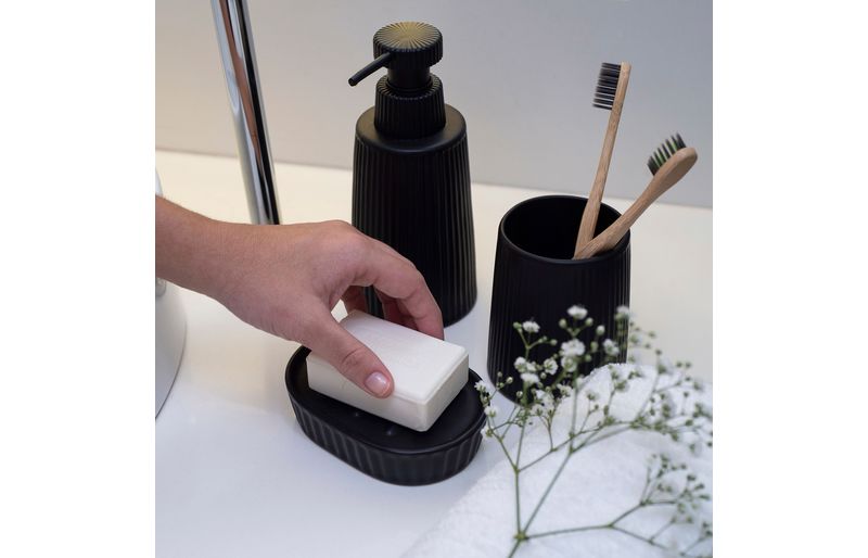 "essa é a saboneteira de resina listras preto da oikos.