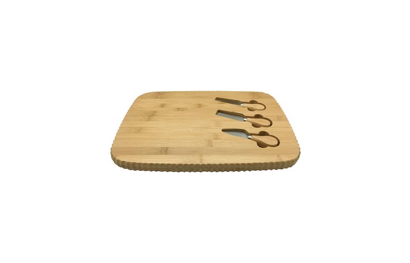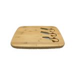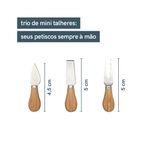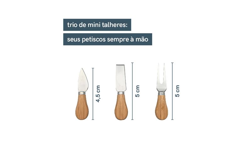 trio de mini talheres: para ter tudo à mão na hora de petiscar, um trio com faca, espátula e garfo fica bem encaixado na própria tábua - tem aquele espacinho para as pontas do dedo conseguirem pegar, sabe?