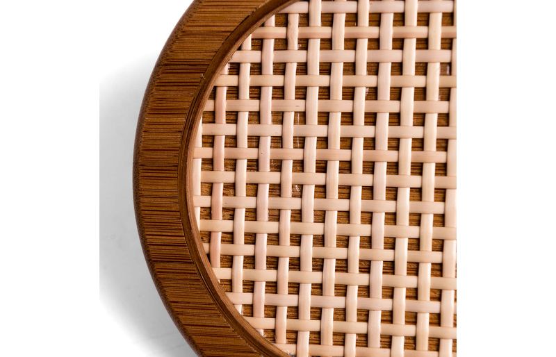 é feita de bambu com textura de palhinha xadrez e base giratória.